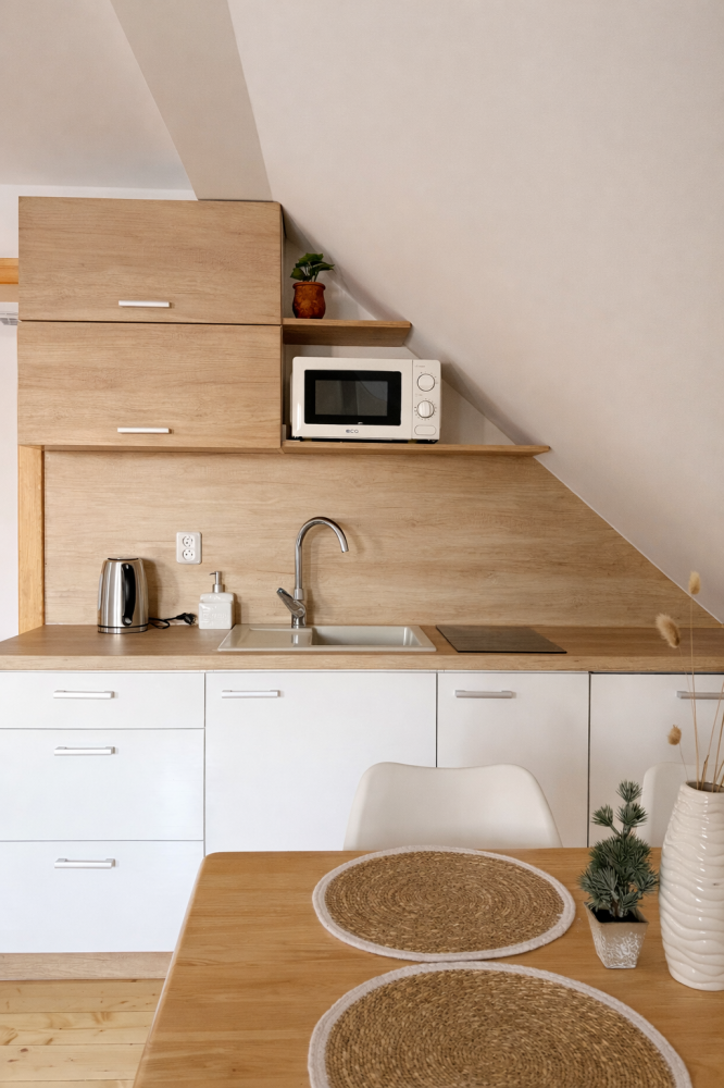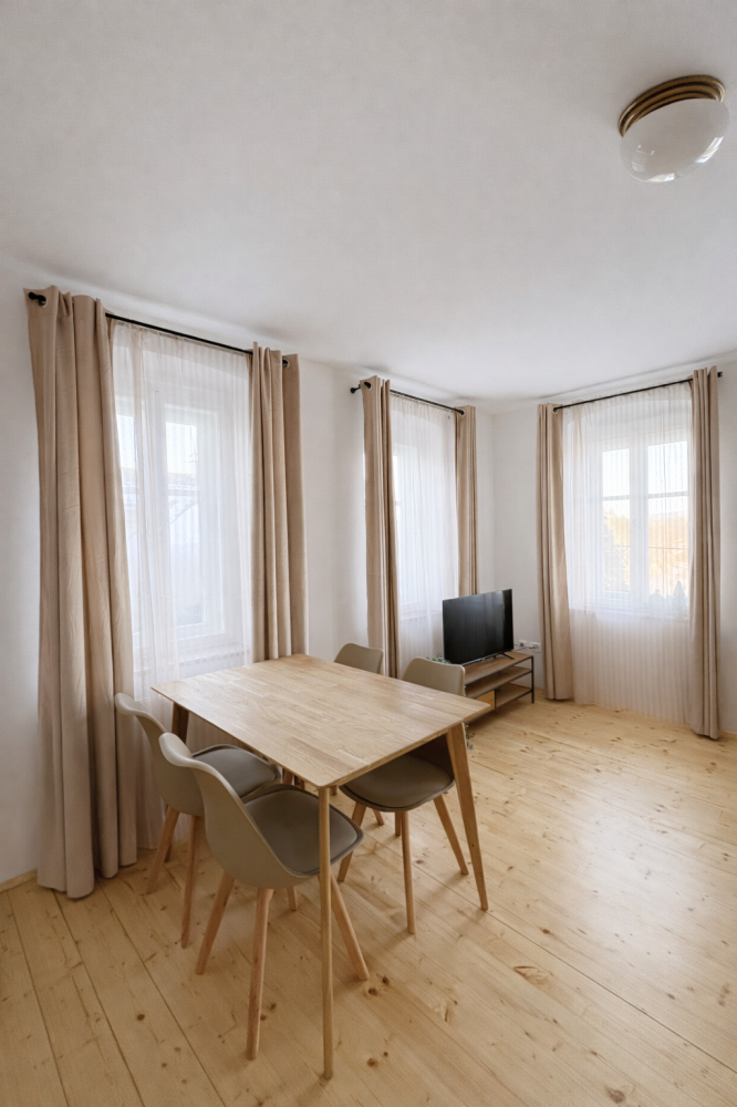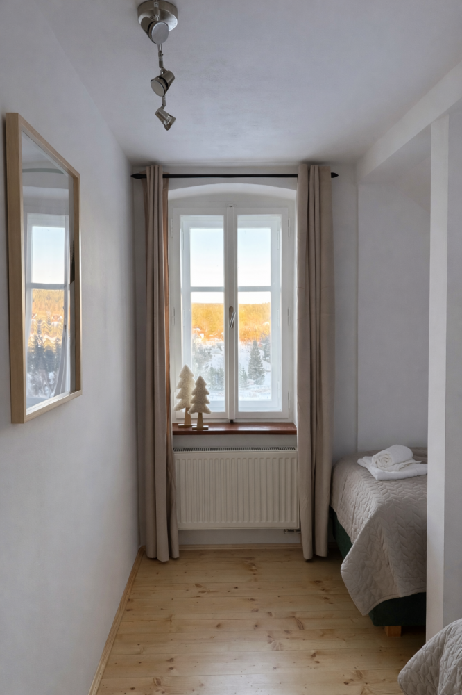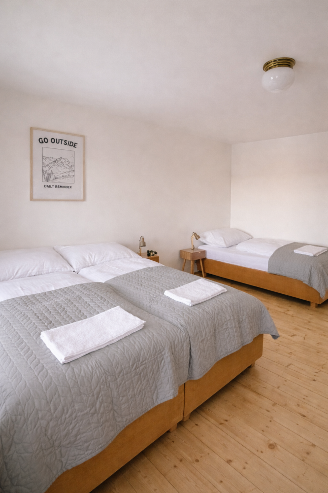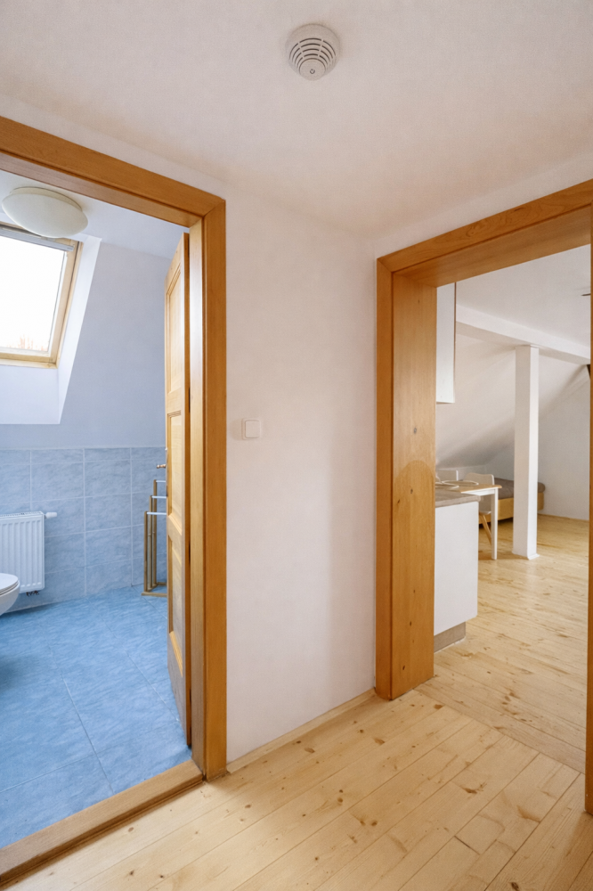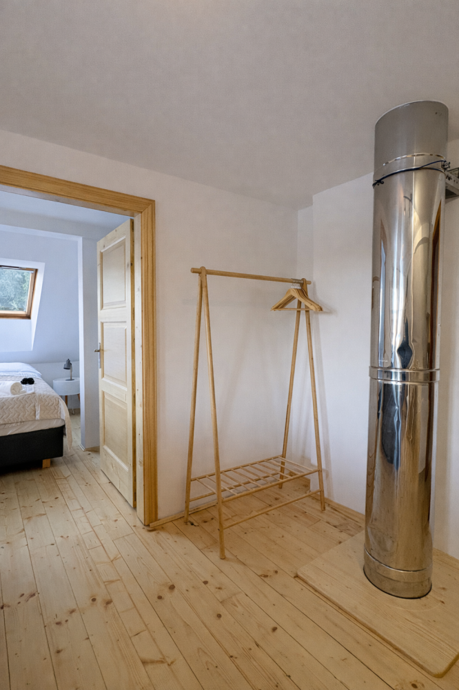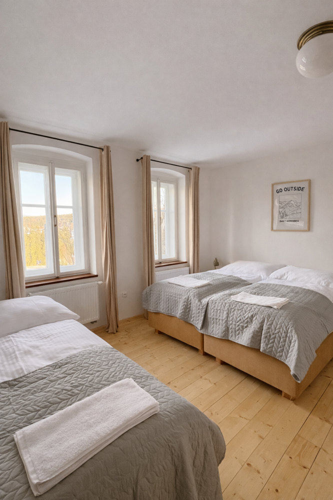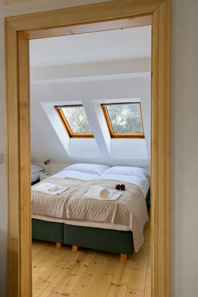 Podkrovní apartmán, kde si užijete klid, dostatek světla a pěkné výhledy do okolní krajiny. Díky oddělené ložnici a obývacímu prostoru nabízí soukromí i místa pro společné chvíle. Ideální pro rodiny i větší skupiny.