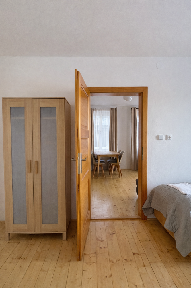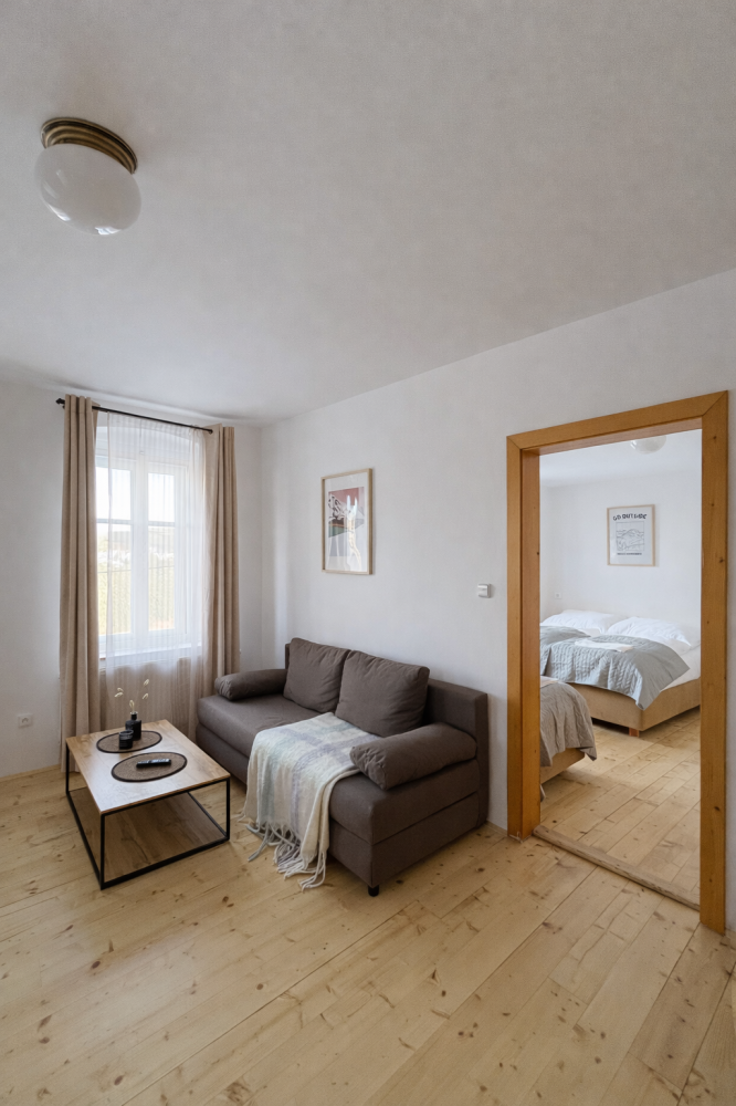 Prostorný apartmán s oddělenou ložnicí, obývacím prostorem a vlastní kuchyní. Vhodný pro rodiny nebo menší skupinu přátel, kteří ocení soukromí a příjemné výhledy.